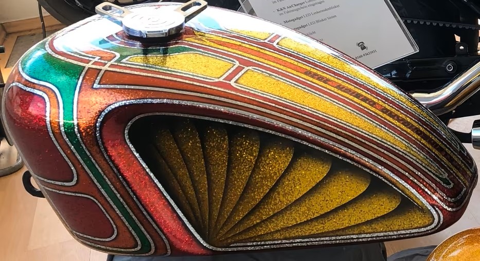 dies war nur ein Beispielfoto, für meiner Meinung nach, einer 70er Jahre Metalflake Lackierung. Is mir persönlich auch zu Bunt, aber die "Arbeit" an sich finde ich absolut geil und es gibt Chopper denen das steht.
